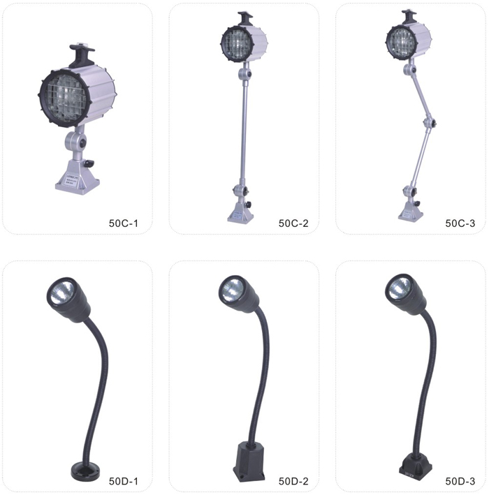 JS.109003 50C、50D系列工作燈 50C工作燈采用新光源鹵鎢燈泡,光線柔和,聚光性好,適用于各種大中型機(jī)床,數(shù)控機(jī)床,加工中心及普通機(jī)床的照明,并具有防水、防爆、防侵蝕等優(yōu)點(diǎn)。 50D適用于中小型機(jī)床,醫(yī)療設(shè)備及汽車(chē)修理、船舶檢修、設(shè)備維修的工作照明?蓛(nèi)裝電子變壓器,輸入不同電壓。